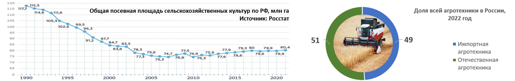 По данным Росстата, в России ежегодно растёт общая посевная площадь сельскохозяйственных культур, в 2022 году она составила более 80 млн га. Из них порядка 36% приходится на фермерские угодья и хозяйства населения.