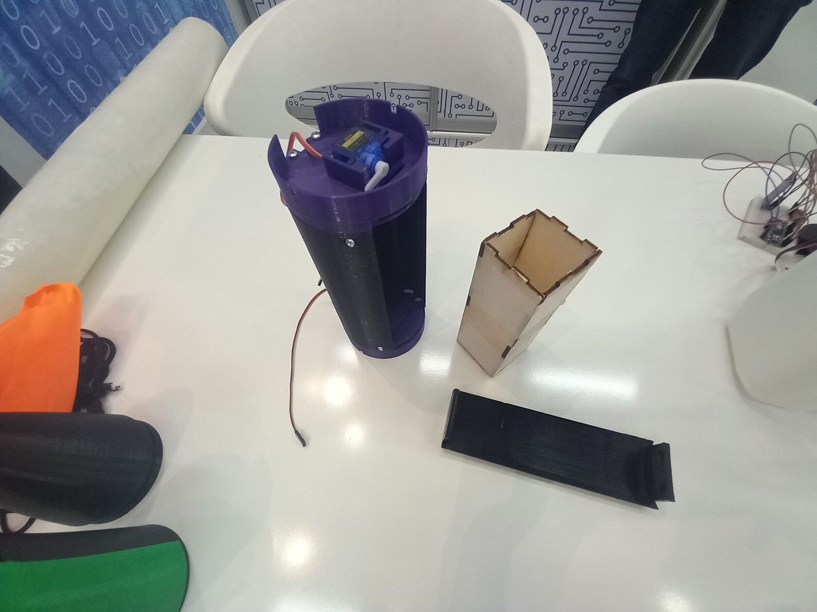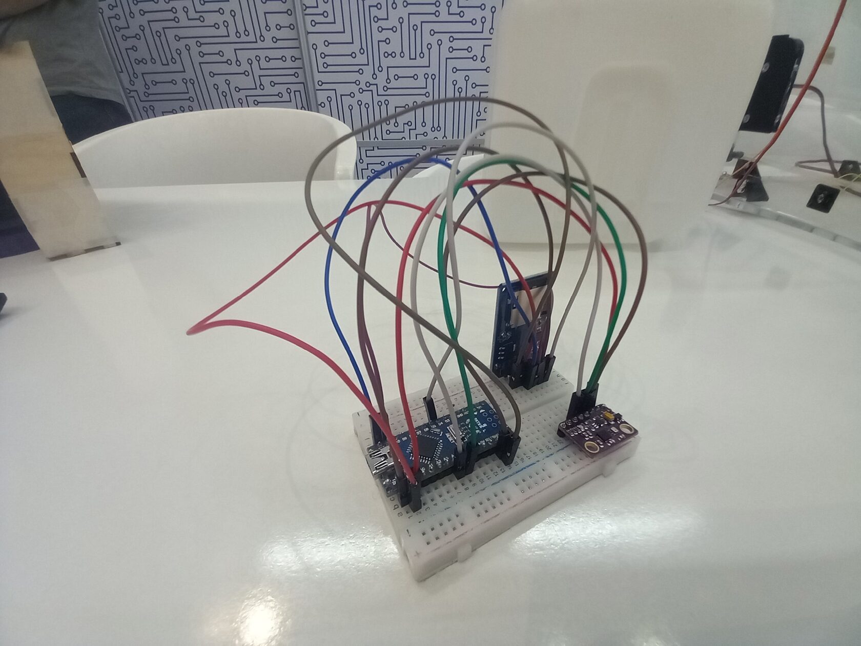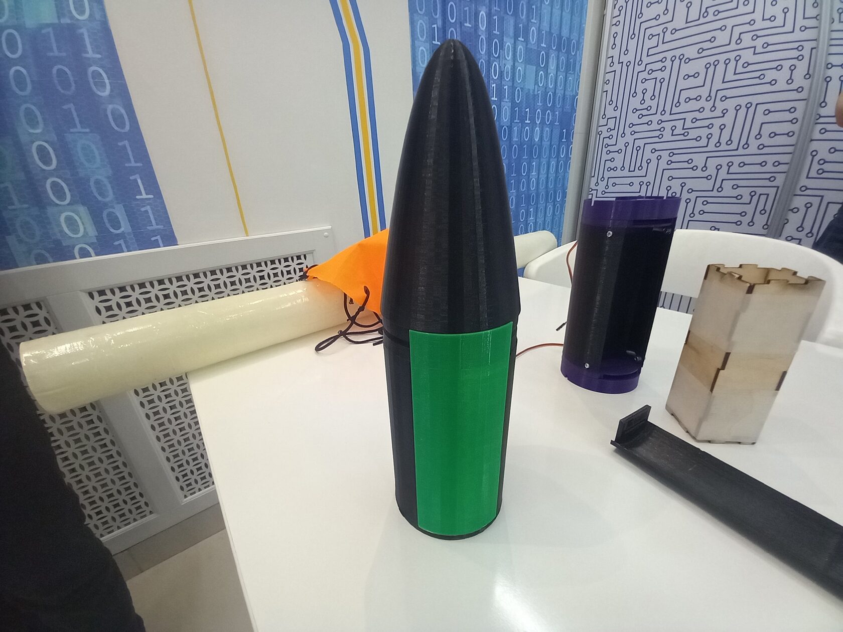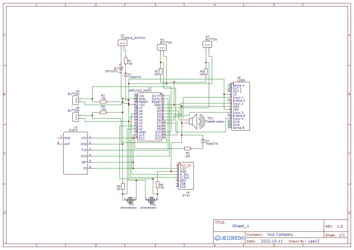 Бортовой компьютер ракеты - это плата Arduino nano. К ней подключается барометр и акселерометр GY-91, радиомодуль SV610, драйвер для моторов постоянного тока, которые будут использоваться в системе спасения, сервомоторы для системы выведения спутника, 2 фоторезистора для проверки срабатывания систем спасения и выведения спутника, кнопки для тестового срабатывания систем спасения и выведения спутника, светодиоды для индикации работы бортового компьютера и пьезопищалка для того, чтобы ракету было легче искать